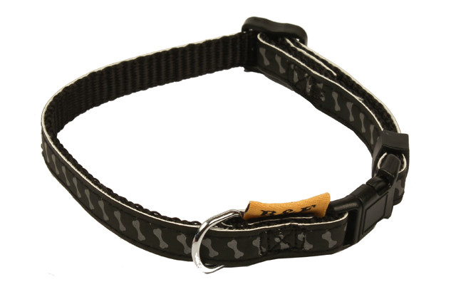 Obojek z popruhu s motivem reflexních kostiček. Zapínání na plastovou přezku. Jednoduchá nastavitelnost obvodu. Je vhodný pro malá plemena. Různé barvy a velikosti.